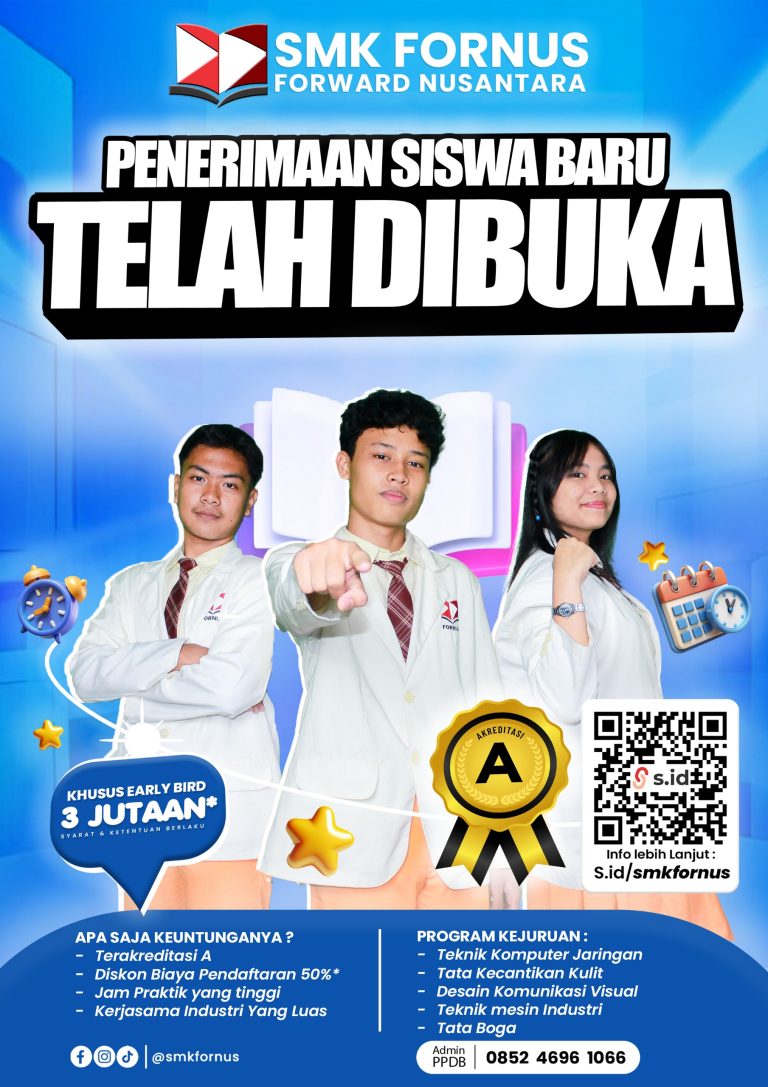 “Wujudkan masa depanmu bersama SMK Forward Nusantara. Daftar sekarang dan raih kesempatan belajar di sekolah dengan fasilitas lengkap dan jurusan favorit dunia industri!”